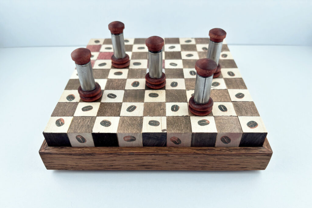 Mixed media, 7.25” x 7.25” x 1.5”, 5 wood and metal game pieces